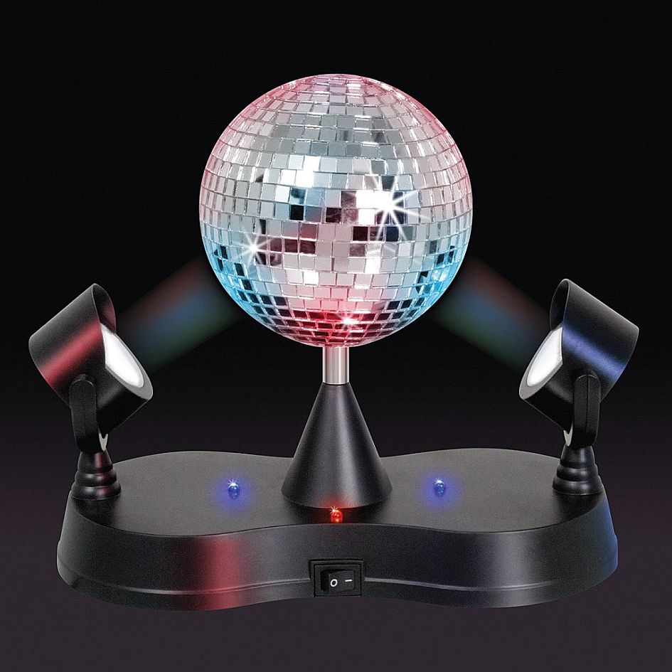 Obracająca sie kula dyskotekowa z mnóstwem miniaturowych lusterek na którą padają dwa snopy kolorowych świateł generowane przez dwa reflektorki z których każdy świeci 6 kolorowymi diodami LED