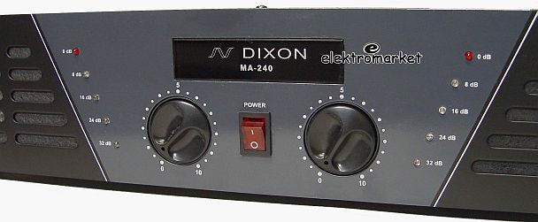 Na przednim panelu znajdują sie potencjometry do regulacji głośności sygnału , włacznik prądowy oraz wskaźniki Diodowe (kolor Niebieski) oddzielnie dla każdego kanału.