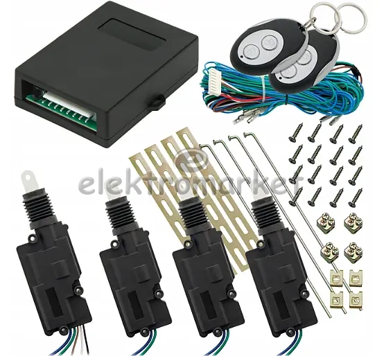 Zestaw zamka centralnego składający się z centralki sterującej, 1 siłownika 5-przewodowego, 3 siłowników 2-przewodowych, dwóch pilotów zdalnego sterowania, przewodów połączeniowych, osprzętu instalacyjnego oraz schematu podłączenia